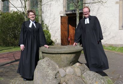Vikar Hendrik Hundertmark und Pastor Rainer Müller-Jödicke freuen sich auf Tauffeste vor der Martinskirche.