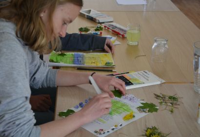 Jugendlich lesen und gestalten Bibeltexte beim Bible Art Journaling.