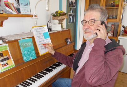 Chorleiter Holger Kiesé gestaltet die aktuellen Proben seines Back to Church-Chores per Telefon am heimischen Klavier. (Foto: Birte Kiesé)