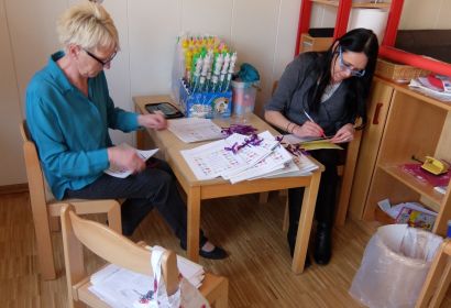 Michaela Hoffmann (links) und Justyna Hetmanski packen Ostertaschen für die Kinder der Martins-Kita in Engelbostel. (Foto: R. Müller-Jödicke)
