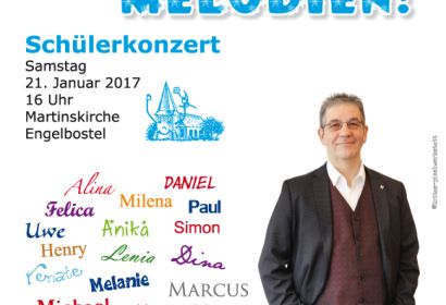 Am Samstag, 21. Januar um 16 Uhr findet bei uns in der Martinskirche das Schülerkonzert "Winter-Wunder-Melodien" unter der Leitung von Holger Kiesé statt.