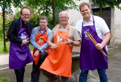„Wir in der Martinskirchengemeinde kennen uns mit Lobgesang aus, aber wir haben auch Humor und können ordentlich feiern“, sagt Kirchenvorsteher Stephan Mörke. Der Kirchenvorsteher hat darum Grillschürzen mit den Worten „Kommt mit Gabeln und Lobgesang“ bedrucken lassen – was an das Gesangbuchlied „Kommt mit Gaben und Lobgesang“ erinnert.