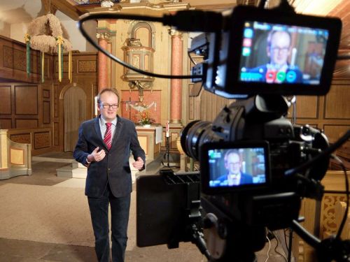 „Lass uns das mal ausprobierten“, motivierte der Fernsehmann Kai-Fabien Rolf Pastor Rainer Müller-Jödicke. Rolf steht sonst hauptberuflich hinter der Kamera und gestaltet ehrenamtlich das Layout des Gemeindebriefes der Martinskirchengemeinde. Er filmte auch schon verschiedene Videobotschaften des Landesbischofs. Nun baute er seine Technik in der Engelbosteler Kirche auf: eine Kamera und vor allem viel Licht!