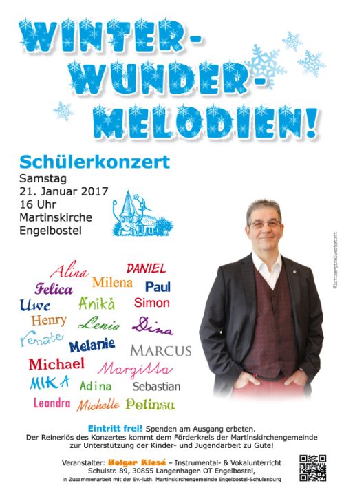 Am Samstag, 21. Januar um 16 Uhr findet bei uns in der Martinskirche das Schülerkonzert "Winter-Wunder-Melodien" unter der Leitung von Holger Kiesé statt.