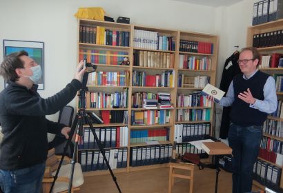 Diakon Merlin Langrehr und Pastor Rainer Müller-Jödicke produzieren ein Erklärvideo für die Konfirmanden der Martinskirchengemeinde.