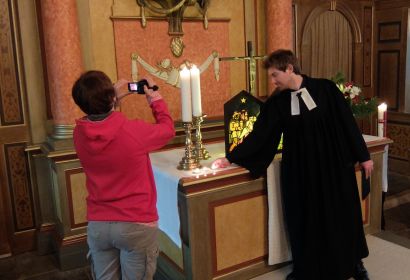 Stephanie Hamburg filmt Vikar Hendrik Hundertmark für das Engelbosteler Weih-nachtsvideo.