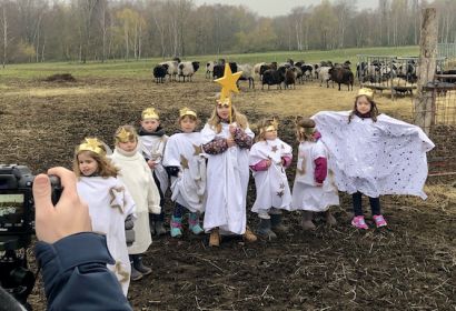 Diakon Merlin Langrehr fotografiert die Kinder aus der Engelbosteler Kita, die als Engel und Hirten die Weihnachtsgeschichte auf der Heidschnuckenweide von Christian Tegtmeyer nachstellen.