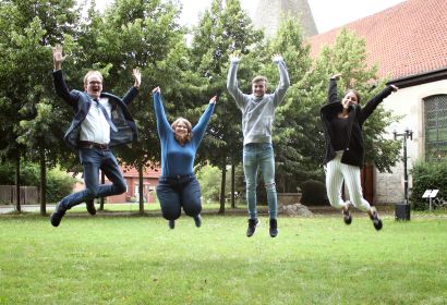 Pastor Rainer Müller-Jödicke jubelt mit Ann-Marie Hamburg, Florian Stelloh und Birte Kiesé (v.l.n.r.) vor der Martinskirche über den Geldsegen aus Hildesheim.