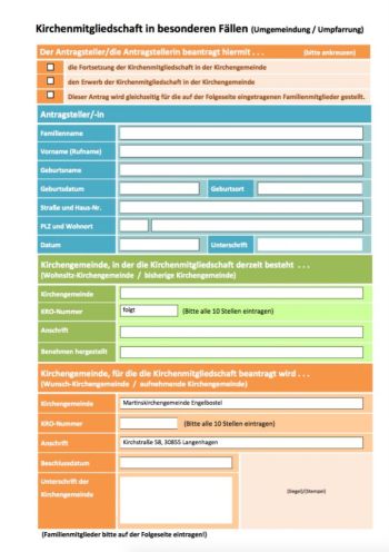 Hier finden Sie den Umpfarrungsantrag zum Downloaden. Dieser ist bereits passend für die Umpfarrung in die Martinskirchengemeinde Engelbostel-Schulenburg vorausgefüllt.
